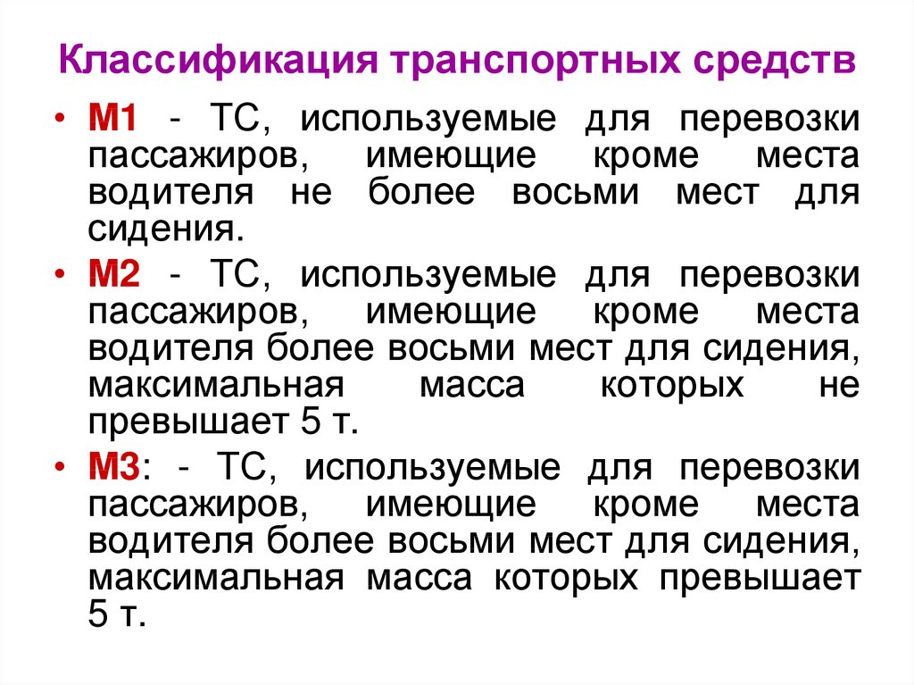 M1 — транспортные средства, используемые для перевозки пассажиров и имеющие, помимо места водителя, не более восьми мест для сидения.