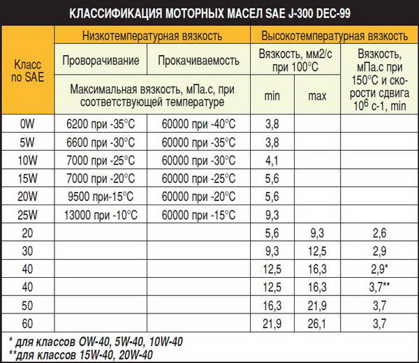 Вязкость моторных масел обозначается по классификации SAE (Society of Automotive Engineers — Общество автомобильных инженеров, США). Требования к физическим свойствам этих вязкостных классов описаны в стандарте SAE J300. В соответствии с этим стандартом моторные масла делятся на 12 классов от 0W до 60.