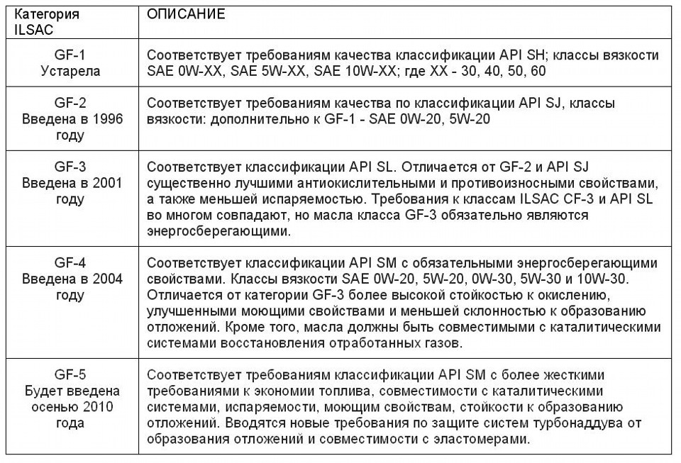 - категория ILSAC GF-2 — принята в 1996 году, она соответствует требованиям качества по категории API SJ, вязкости: дополнительно к GF-1 — SAE 0W-20, 5W-20;
