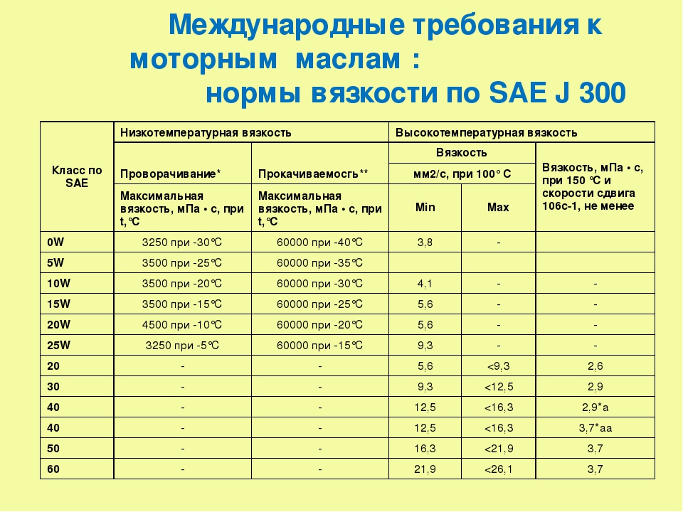 Буква W перед цифрой означает, что масло приспособлено к работе при низкой температуре (Winter — зима). Для этих масел кроме минимальной вязкости при 100°C дополнительно дается температурный предел прокачиваемости масла в холодных условиях. Предельная температура прокачиваемости означает минимальную температуру, при которой насос двигателя в состоянии подавать масло в систему смазки. Это значение температуры можно рассматривать как минимальную температуру, при которой возможен безопасный пуск двигателя.
