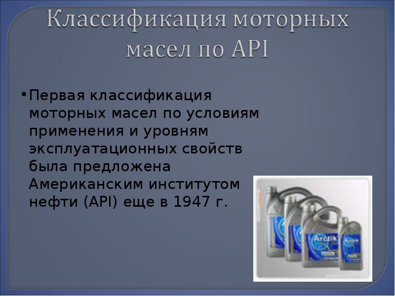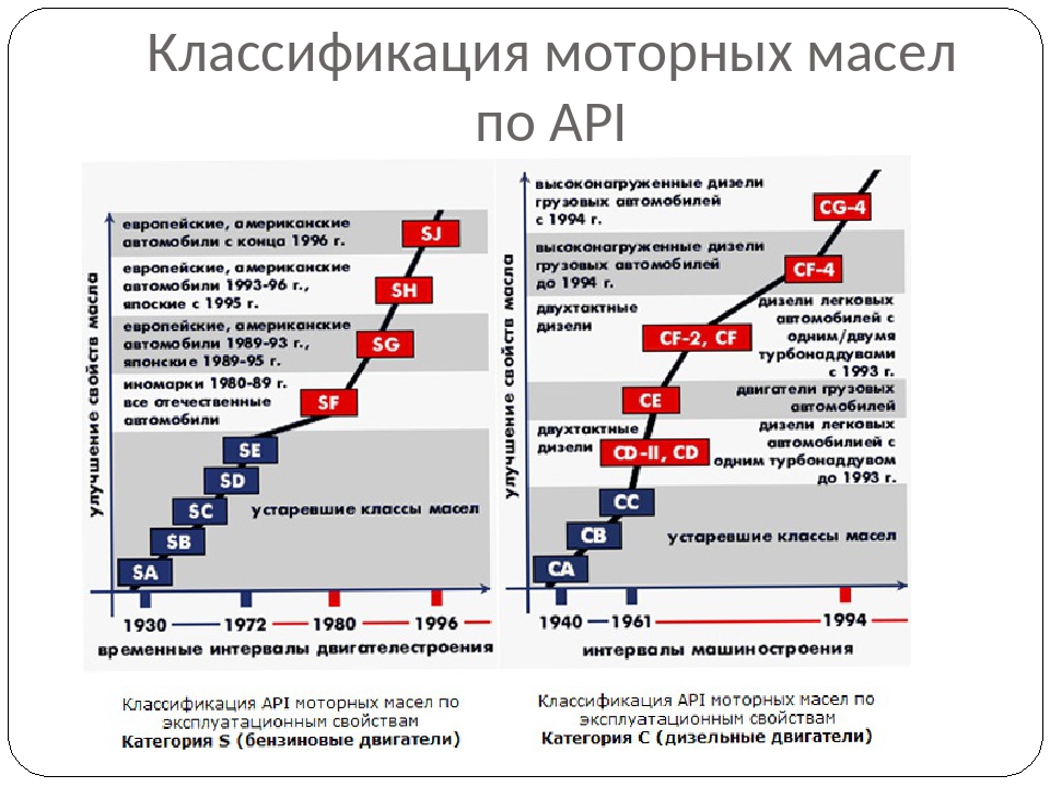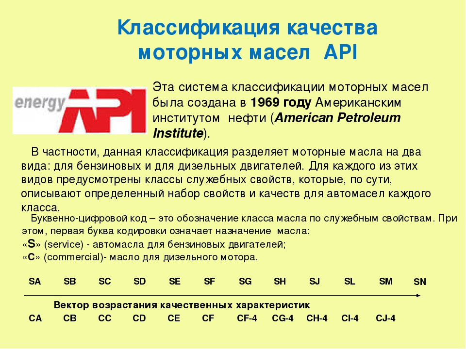 В 1970 году все существующие масла могли быть охвачены четырьмя классификациями S (SA SD) и четырьмя классификациями C (CA CD). С тех пор количество классификаций API почти удвоилось.