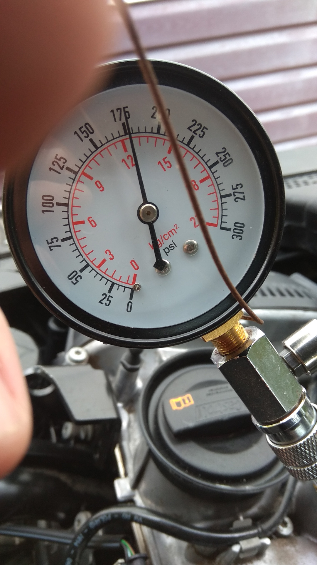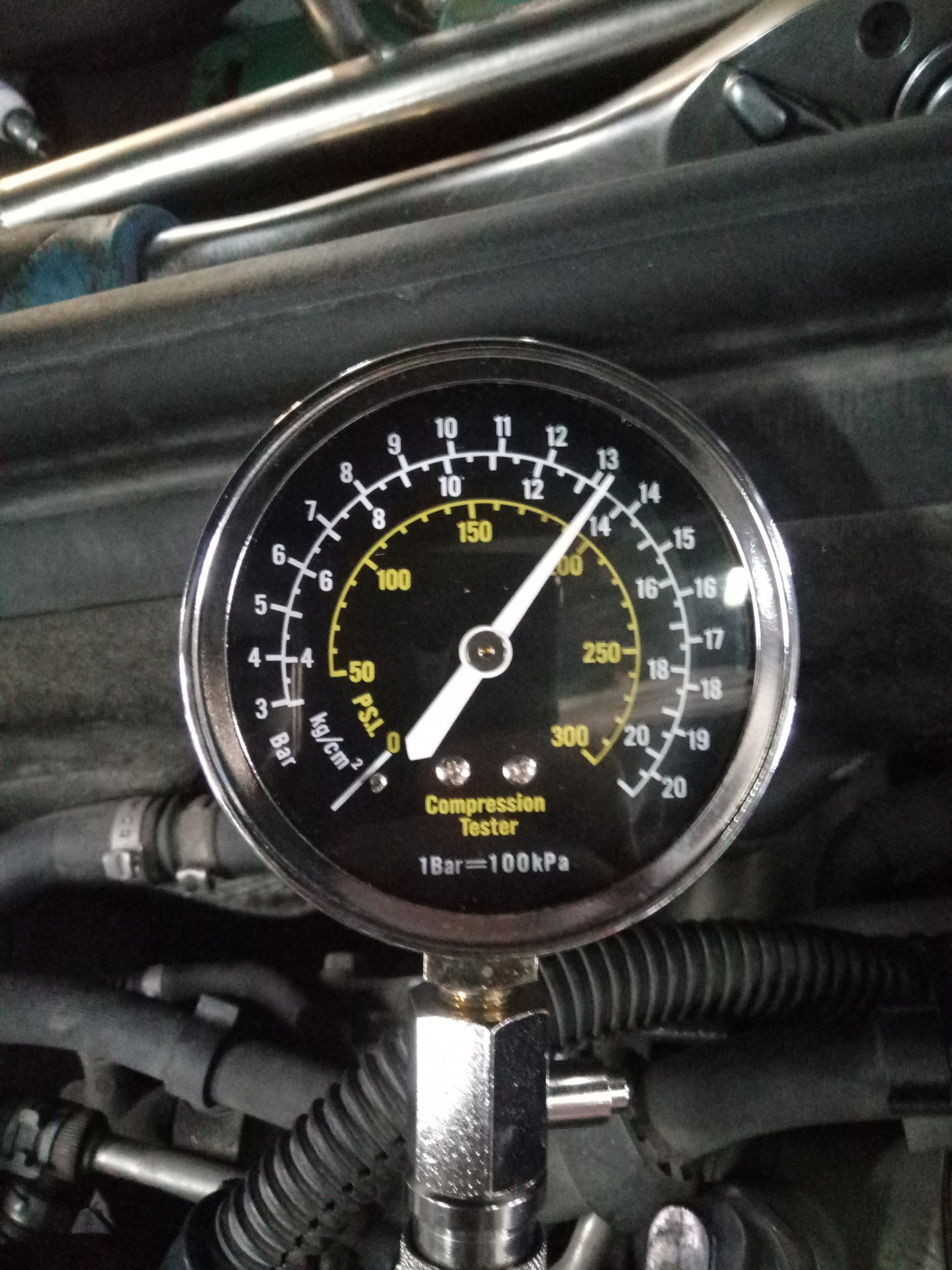 Компрессия двигателяДроссельная заслонка также должна быть открыта. Затем двигатель запускается на несколько секунд, пока датчик компрессии находится в отверстии для свечи зажигания. Регистрируется максимальное значение сжатия, затем процесс повторяется для каждого из оставшихся цилиндров.