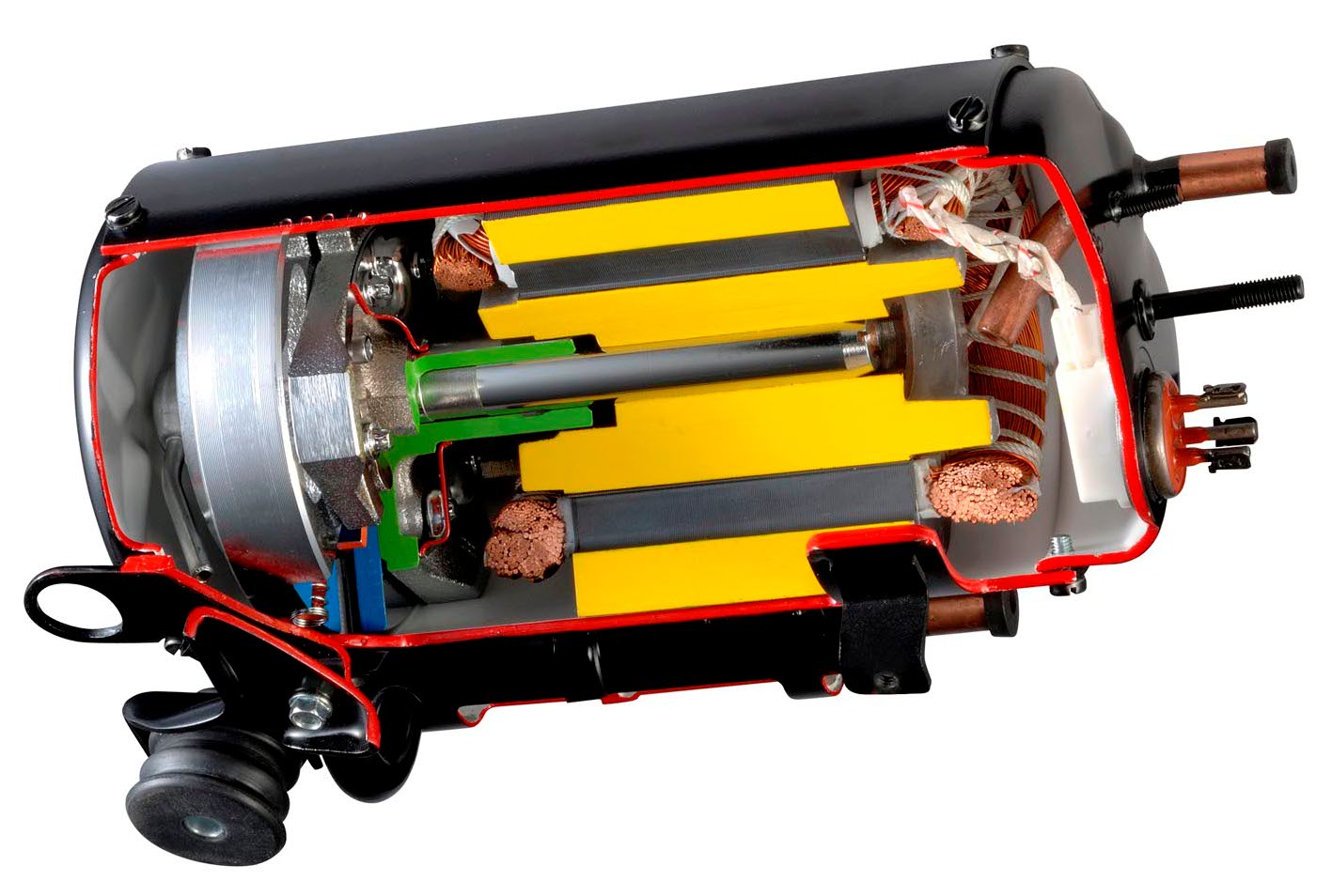 Чаще всего в кондиционерах используются герметичные поршневые компрессоры, в которых электродвигатель расположен внутри герметичного корпуса.
