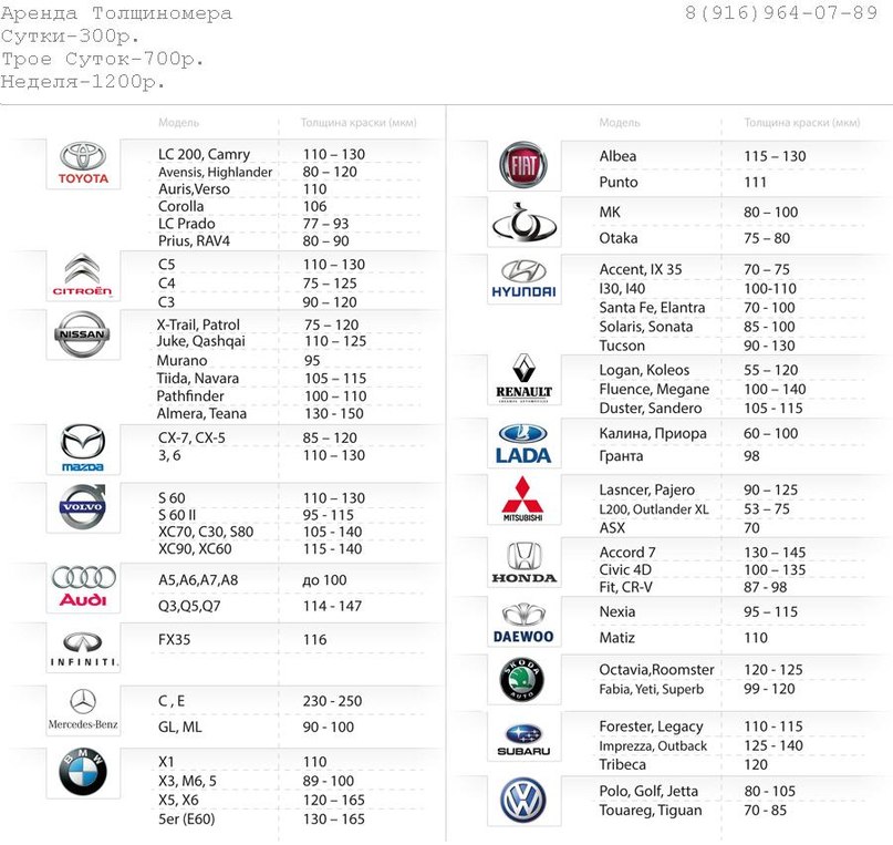 В интернете вы можете найти таблицу заводской толщины для разных моделей и марок. Эксперты рекомендуют при покупке машины измерять толщину ЛКП.