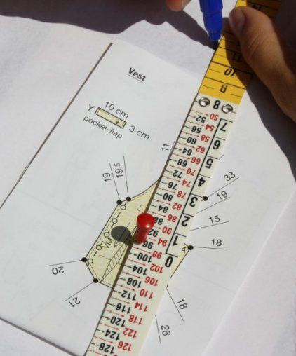 Возле цифр есть отверстия. Около цифры, которая соответствует нужным размерам, необходимо вставить иглу и приколоть ее к центру крестика на выкройке. Метр с выкройкой крепится на большой лист бумаги, размера которого хватит, чтобы на нем поместилось лекало, выкроенное в натуральную величину.