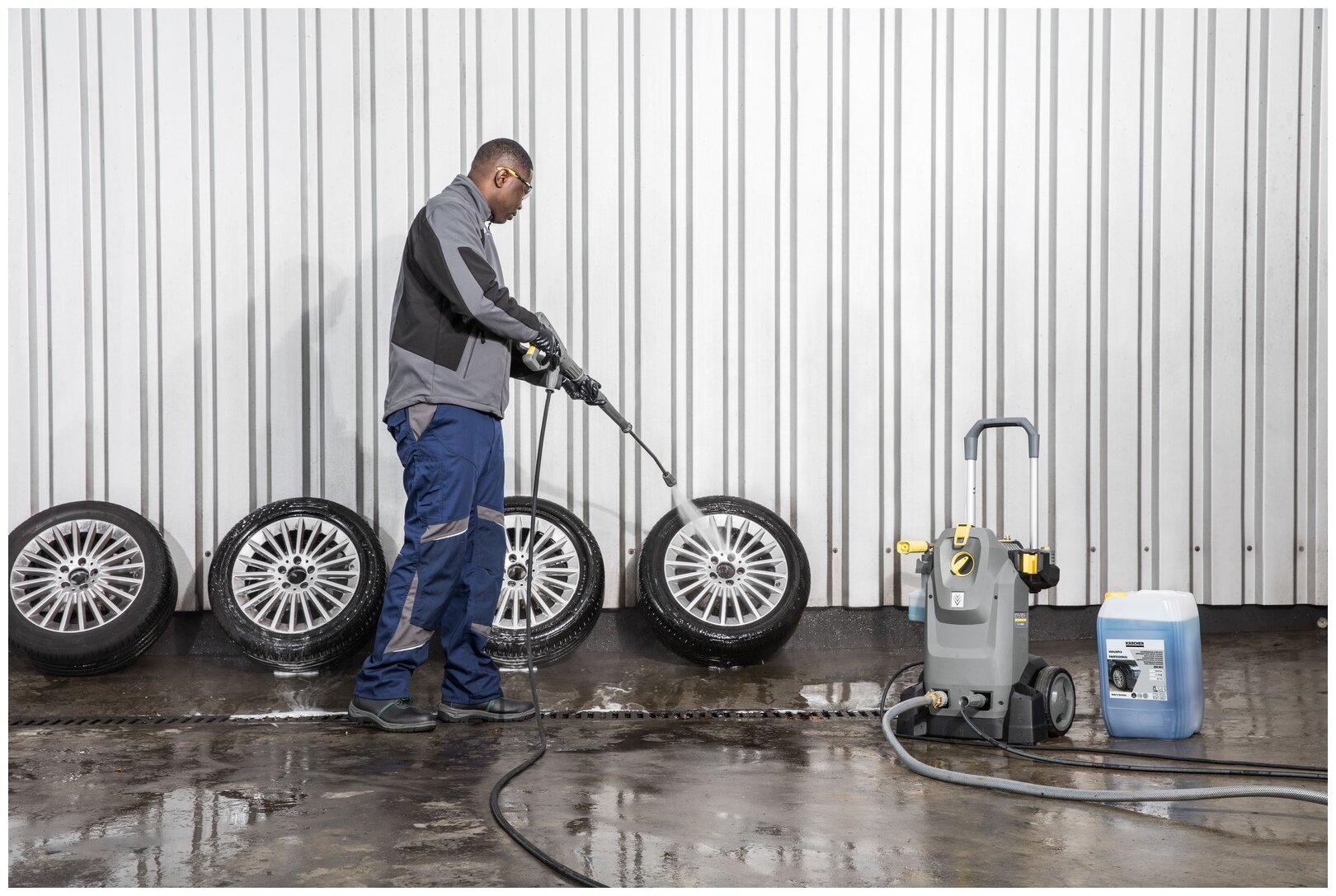 Экономное моющее оборудование из разряда недорогих, но функциональных. Отличается умеренным потреблениям энергии и воды. Из недостатков сразу отметим слишком маленький шланг с длиной каких-то 5 метров, который придётся заменить. Плохо функционирует насадка, предназначенная для взбивания автохимии в пену. Неудобными являются и транспортировочные колёсики из-за своего небольшого размера. Однако нельзя не отметить приемлемую стоимость такого оборудования по сравнению с другими аналогами. Для забора можно использоваться любую имеющуюся под рукой ёмкость. И, кстати, максимальная температура воды может достигать 50 градусов.