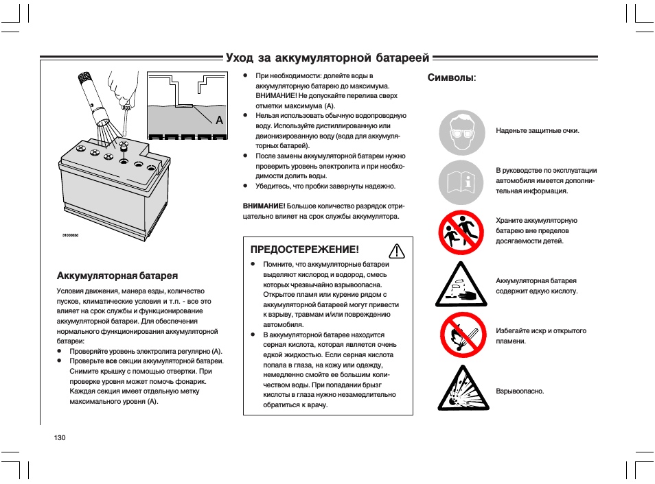 Также и сам аккумулятор может показать, что его пора меня. Прежде всего, это возраст. Если аккумулятору больше трех-четырех лет, то скоро начнутся проблемы. Во-вторых, задумайтесь о том, как Вы водите. Помните, что короткие поездки и длительные простои сокращают срок службы аккумулятора. В-третьих, следите за состоянием аккумулятора. Если Вы обнаружите следы коррозии, то аккумулятор где-то протекает. Если аккумулятор находится в изоляционном корпусе, необходимо его снимать каждый раз во время проверки. Проверьте также клеммы на наличие наростов. Наросты можно удалить при помощи пищевой соды и воды — не забудьте надеть защитные перчатки и очки. Раствор электролита содержит серную кислоту, которая может оставить ожоги на коже рук. Наконец, понюхайте аккумулятор, обратите внимание, если почувствуете запах тухлого яйца (сера) или что аккумулятор перегревается.
