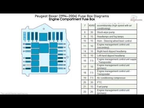 Peugeot Boxer начали производить ещё в 1994 году. Огромное количество различных вариантов исполнения, 3 местная кабина, экономичные и не прихотливые двигатели, сделали данную модель очень популярной на рынке. Мы покажем схемы блоков предохранителей и реле с описанием для пежо боксер 2006, 2007, 2008, 2009, 2010, 2011, 2012, 2013, 2014, 2015, 2016, 2017, 2018, 2019 годов выпуска, а так же предоставим для скачивания полное руководство по эксплуатации.