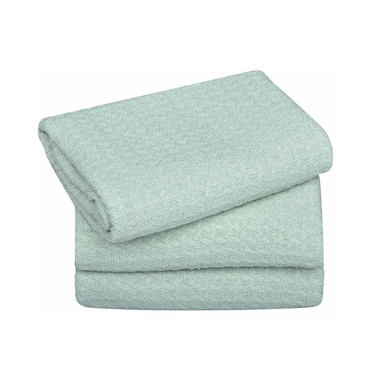 Зеленое полотенце из микрофибры для занятий фитнесом, йогой, тренажерным залом и т. д., вид сверху на белом фоне