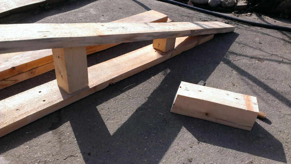 Такой вариант эстакады наиболее мобильный и простой. Изготавливается очень просто: деревянные дощечки устанавливаются одна на одну лесенкой. Важно учитывать ширину дерева, чтоб автомобильное колесо смогло пройти. Также обратите внимание на высоту, чем выше вам нужно поднять авто, тем больше дощечек понадобится.