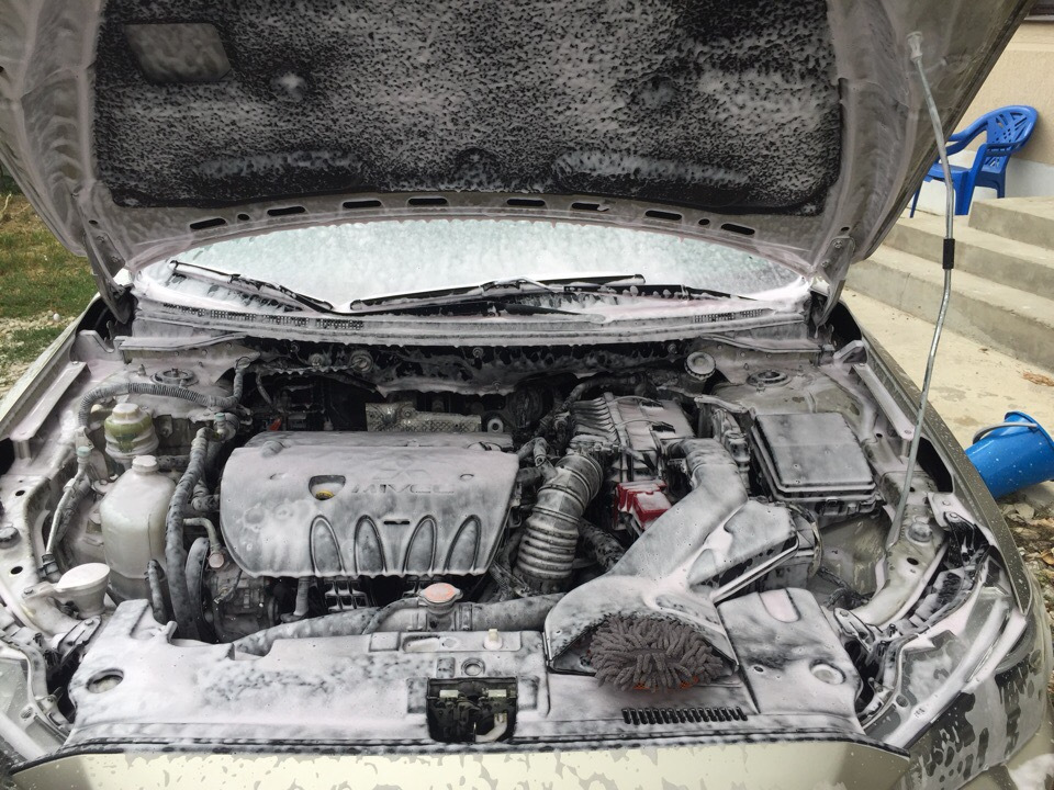 - Если поверхности загрязнены не сильно, то мойка подкапотного пространства без автохимии тоже позволяет получить блестящий результат.