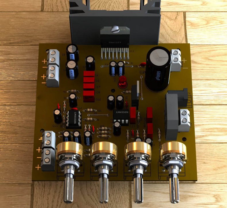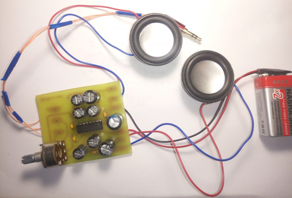 Из электрических параметров хочется отметить очень высокую линейность в рабочем диапазоне частот 20ГцкГц. Недостатки есть — куда без них — несколько повышенный уровень шума, однако этот недостаток можно немного компенсировать — ниже посмотрим как. Идеальный вариант для дачи, деревни, короче говоря, для тех ситуаций, где дорогую технику использовать нежелательно, а громкого звука ну уж очень хочется. Схема: Печять: Как видите — проще уже некуда.