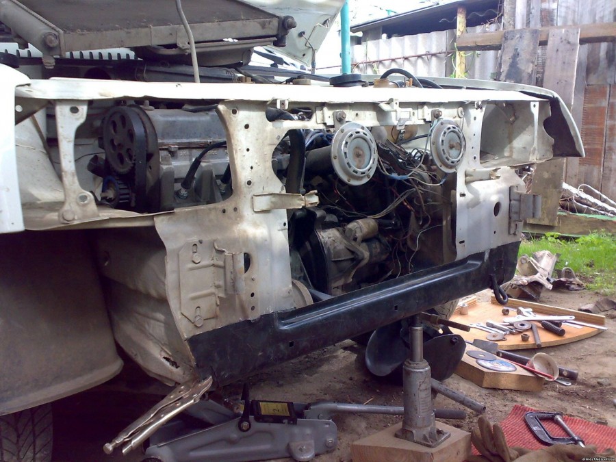 10.2012Вытянул все то смог сам, один и без помощников, рука от кувалды высыхала до уужаса…Выправил жестянку, подогнал фары на место, и решётку радиатора.Припаял нижние крепление под восмерочный радиатор, встал как родной:)отрегулировал фары, и решил покататься, соседи обалдели что все сделал сам:)приятно когда все делаешь сам и все получаетсявот несколько фоток