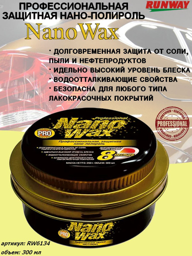Защитный воскRunway Nano Wax Professional представляет собой воск для полировки кузова автомобиля. В ее основе лежит воск карнаубы, дополненный нано-технологичными полировальными агентами. Абразивов в составе нет.