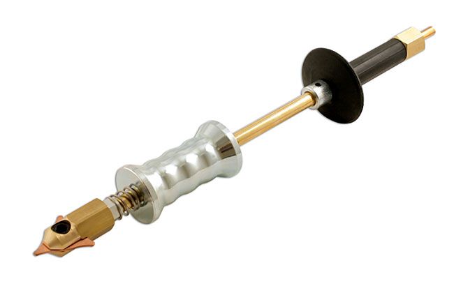 Устройство данного типа разрешает произвести щадящий ремонт кузова без сверления или сварки металла. Резиновая насадка прикладывается к поврежденному кузову. На обратной стороне полого штыря имеется штуцер для присоединения к компрессорному устройству с целью создания вакуума. Это эффективный обратный молоток, съемник которого в виде мягкой груши практически не повреждает лакокрасочное покрытие во время рихтовки.
