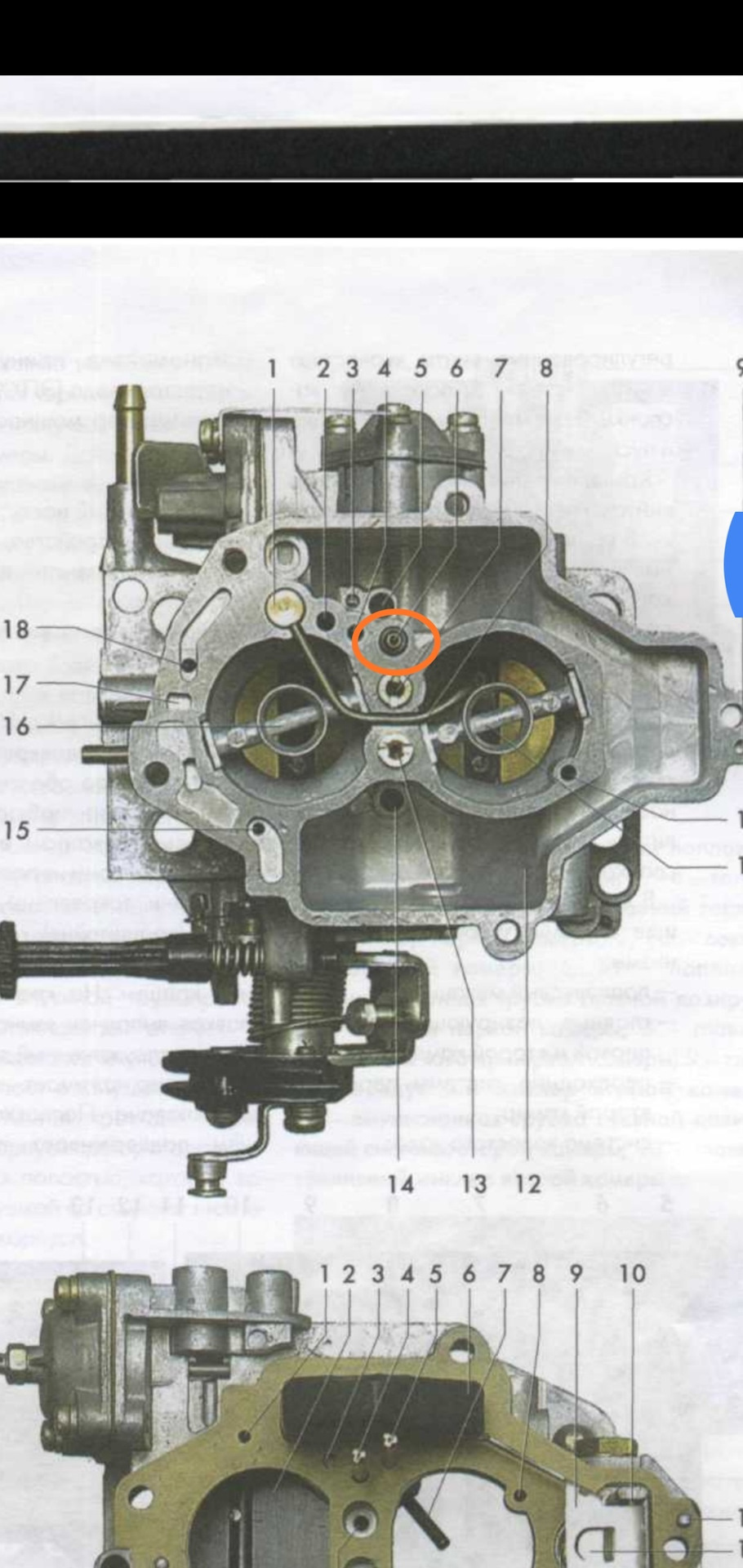 5 – Дроссельная заслонка вторичной (второй) камеры должна быть закрыта. Правильное положение этой заслонки регулируется стопорным винтом. Правильное положение такое – заслонка не должна заклиниваться в диффузоре ( при нажатии на педаль газа должна открываться плавно, без рывка ) и не должна быть приоткрыта.