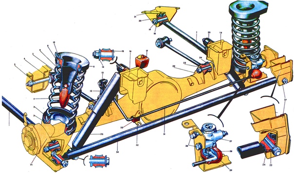 Подвеска служит для обеспечения плавного хода автомобиля, смягчая воспринимаемые колесами толчки и удары при наезде на неровности дороги. Поэтому основной частью подвески являются упругие элементы, связывающие раму с передним и задним мостами или с колесами и поглощающие толчки при наезде колес на препятствия. Кроме того, в состав подвески могут входить амортизаторы, гасящие медленно затухающие колебания рамы автомобиля, стабилизаторы (у легковых автомобилей), уменьшающие боковой крен Кузова при повороте, и направляющие устройства для передачи толкающих и тормозных усилий от колеса к раме.