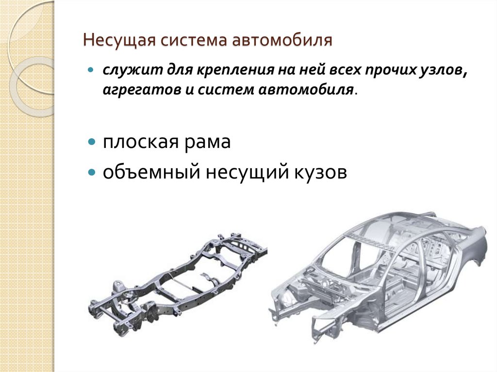 Кузов и рама, порознь или вместе, воспринимают вес агрегатов автомобиля и пассажиров, а также нагрузки при торможении и разгоне, при крене и переезде через неровности дороги.