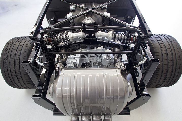 Задний конец пружины упирается в перегородку между моторным отсеком и салоном. Для передачи усилия от амортизатора к пружине пришлось ввести дополнительный рычаг, качающийся в вертикальной продольной плоскости вдоль каждого борта. Один конец рычага шарнирно соединен с верхней частью амортизатора, а другой также шарнирно соединен с перегородкой. Посередине рычаг имеет пружинный упор.