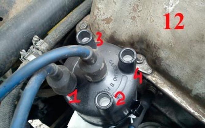 На самом двигателе нумерация цилиндров идет от места расположения ремня ГРМ к стартеру, то есть слева направо. Ближе всего к стартеру располагается четвертый цилиндр, а к ремню ГРМ первый. При подключении важно смотреть из какого гнезда крышки трамблера идет провод, если перепутать их расположение автомобиль не заведется.