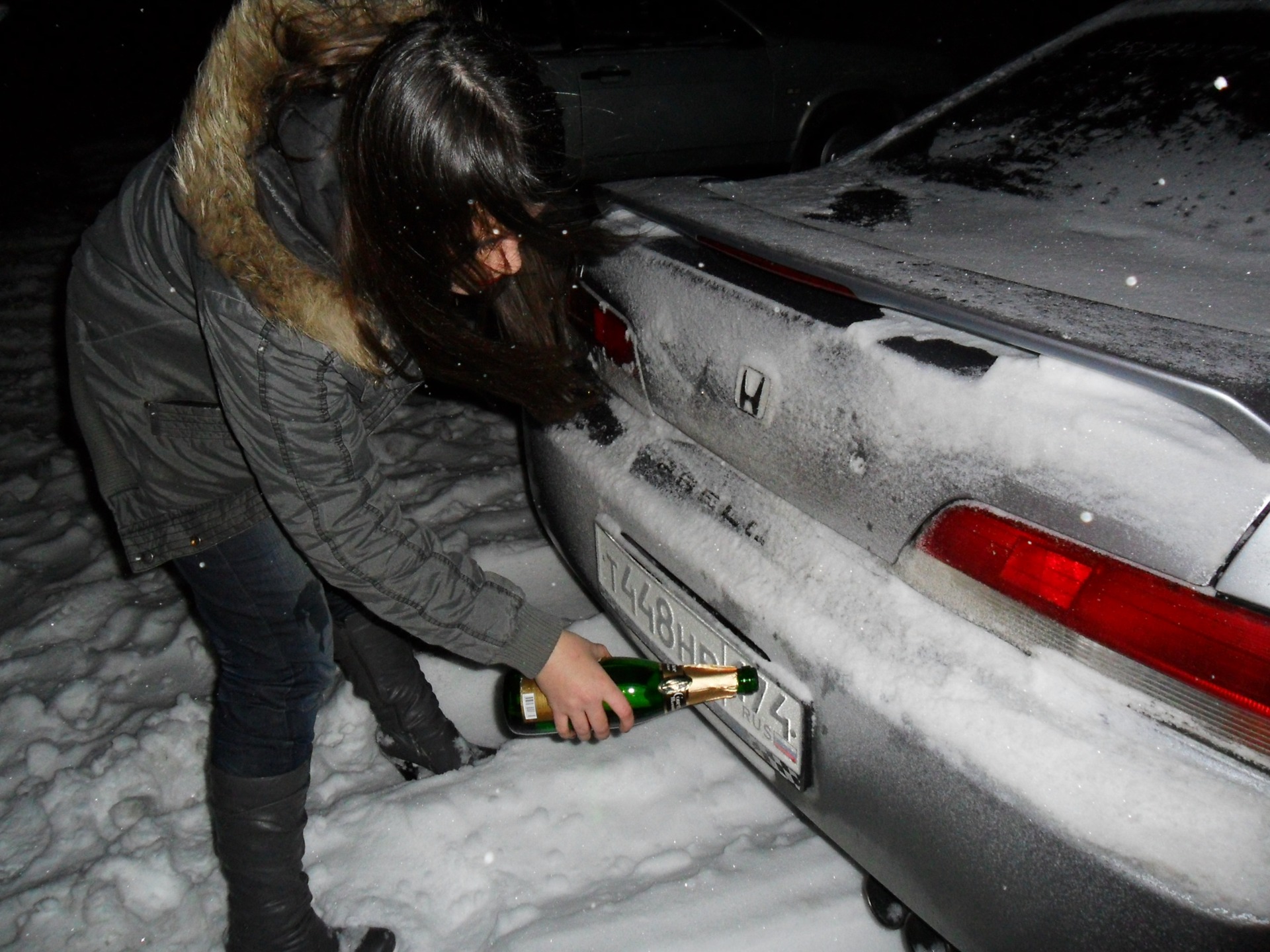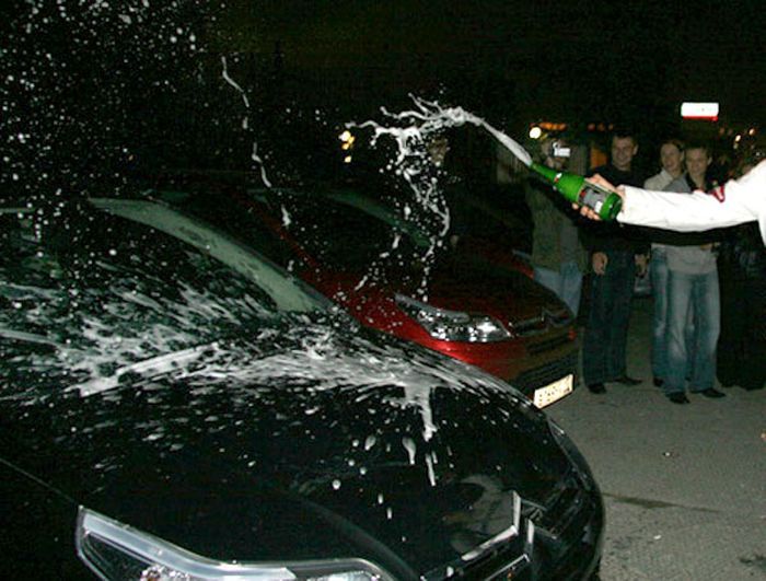 Пункт 3. Для ритуала «обмывки машины» неоходима ЖИДКОСТЬ, что следует из самого названия ритуала. Некоторые дамы считают шампанское наиболее подходящей жидкостью. Это ЗАБЛУЖДЕНИЕ! Шампанское подходит для ритула «спуска яхты на воду». Если вам сильно хочется использовать шампанское, убедитесь, что вы купили именно МАШИНУ, а не яхту!