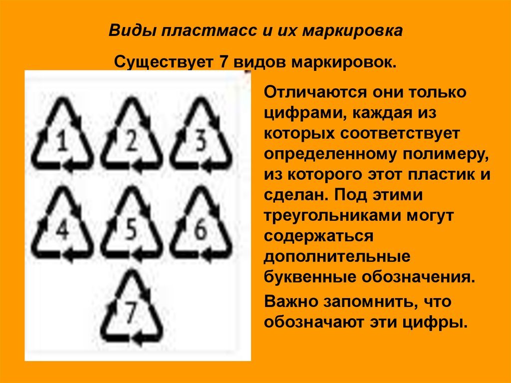 Π§ΡΠΎΠ±Ρ Π½Π΅ Π½Π°Π²ΡΠ΅Π΄ΠΈΡΡ ΡΠ΅Π±Π΅ ΠΈ ΠΎΠΊΡΡΠΆΠ°ΡΡΠ΅ΠΉ ΡΡΠ΅Π΄Π΅, Π²Π°ΠΆΠ½ΠΎ ΡΠ°Π·Π±ΠΈΡΠ°ΡΡΡΡ Π² ΠΌΠ°ΡΠΊΠΈΡΠΎΠ²ΠΊΠ΅ ΠΏΠ»Π°ΡΡΠΈΠΊΠ°. ΠΠ½Π°ΠΊΠΈ (Π±ΡΠΊΠ²Π΅Π½Π½ΡΠ΅ ΠΈ ΡΠΈΡΡΠΎΠ²ΡΠ΅ ΠΎΠ±ΠΎΠ·Π½Π°ΡΠ΅Π½ΠΈΡ), Π½Π°Π½Π΅ΡΠ΅Π½Π½ΡΠ΅ Π½Π° ΠΈΠ·Π΄Π΅Π»ΠΈΠ΅ ΠΈΠ»ΠΈ ΡΠΏΠ°ΠΊΠΎΠ²ΠΊΡ, Π² ΠΎΠ±ΡΠ·Π°ΡΠ΅Π»ΡΠ½ΠΎΠΌ ΠΏΠΎΡΡΠ΄ΠΊΠ΅ ΡΠΎΠ΄Π΅ΡΠΆΠ°Ρ ΡΠ²Π΅Π΄Π΅Π½ΠΈΡ ΠΎ Π²ΠΈΠ΄Π΅ ΠΏΠ»Π°ΡΡΠΈΠΊΠ°, ΠΈΠ· ΠΊΠΎΡΠΎΡΠΎΠ³ΠΎ ΠΈΠ·Π³ΠΎΡΠΎΠ²Π»Π΅Π½ ΡΠΎΠ²Π°Ρ. Π Π°ΡΡΠΌΠΎΡΡΠΈΠΌ, ΠΊΠ°ΠΊΠΈΠ΅ ΡΠ°Π·Π½ΠΎΠ²ΠΈΠ΄Π½ΠΎΡΡΠΈ ΠΏΠ»Π°ΡΡΠΈΠΊΠ° ΡΡΡΠ΅ΡΡΠ²ΡΡΡ ΠΈ ΠΊΠ°ΠΊΠ°Ρ ΠΌΠ°ΡΠΊΠΈΡΠΎΠ²ΠΊΠ° ΠΈΠ΄Π΅Π½ΡΠΈΡΠΈΡΠΈΡΡΠ΅Ρ ΠΊΠ°ΠΆΠ΄ΡΠΉ ΠΈΠ· Π½ΠΈΡ .