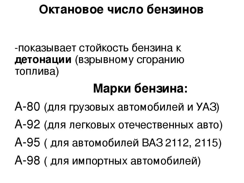 Такое определение означает, что бензин, обозначаемый маркой А-95, будет характеризоваться детонационными свойствами, аналогичными 95% смеси изооктана и н-гептана.