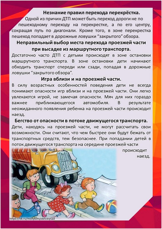 — отсутствие навыков выполнения действий по безопасности движения и неосознанное подражание нарушающим ПДД взрослым, чаще всего родителям,