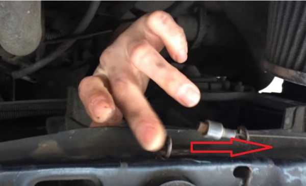 - Далее необходимо добраться рукой к верхней части радиатора, где находится замок капота. Если рука не достает, то возьмите плоскогубцы.