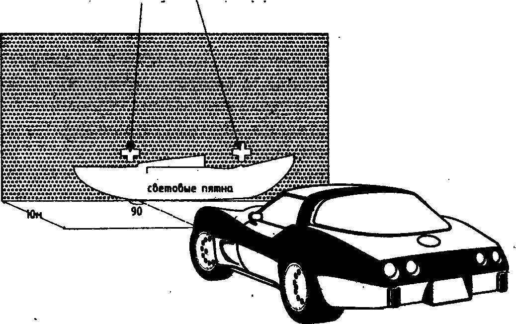 Производится отметка до центральной оси транспортного средства, благодаря чему образуется чертеж с двумя точками центров оптических приборов и ограничениями верхнего и нижнего предела света.