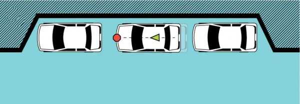 Примечание. Расстояние между стоящими автомобилями на схеме невелико — всего 2 длины нашего автомобиля. Поэтому припарковаться передом не получится, т.к. задняя часть автомобиля будет существенно выступать из «кармана».