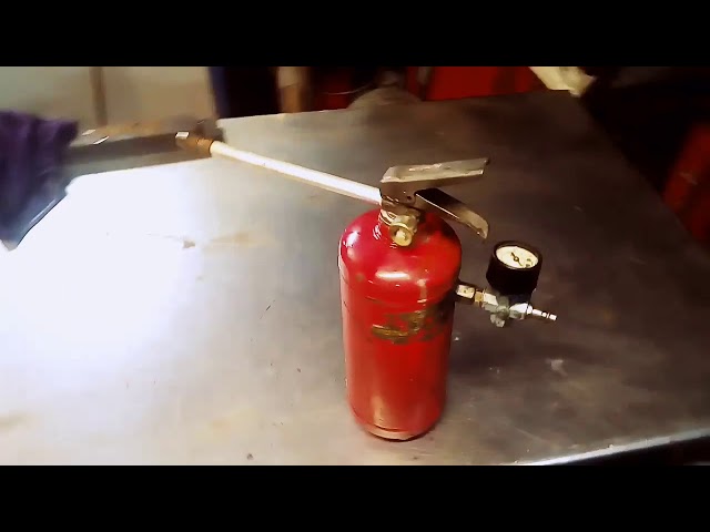 Помимо самого корпуса потребуется шланг, металлическая трубка, хомуты, манометр и запорный клапан. К верхней части огнетушителя следует приварить горловину, с прочной крышкой. К боковой стороне горловины приварить трубку (0,5 дюйма) с резьбой. С помощью переходника соединить трубку и шланг.