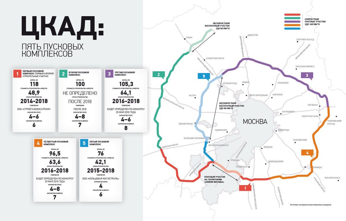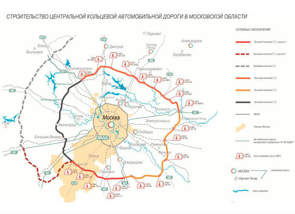 Еще один крупный инфраструктурный проект, призванный разгрузить значительный объем трафика с МКАД и федеральных радиальных дорог, — это Центральная кольцевая автомобильная дорога: четырех-восьмиполосная супермагистраль частично будет построена заново, а частично — с использованием существующих участков автомагистрали A107 Малая Москва. КАД, примерно в 30 км от МКАД, и Большая МКАД (A108), которая еще примерно на 30 км дальше.
