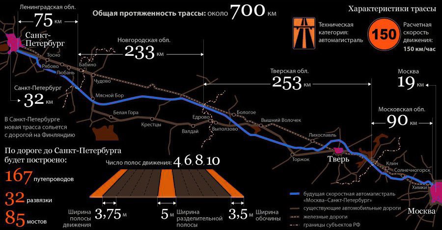 продажи @ intellinews. Если вы больше не желаете получать наши электронные письма, отпишитесь здесь. Москва — Санкт-Петербург платная автомагистраль (Невский экспресс) Москва, Тверская, Новгородская, Ленинградская области и Санкт-Петербург (новое строительство) Новая платная скоростная автомагистраль между двумя столицами станет резервом перегруженной автомагистрали М-10.Дорога будет обходить все населенные пункты. Основные параметры: Участок 390 км –543 км: Мост через реку Мста: Мост через реку Волхов: Участок 15 км — 58 км: Участок включает 7 транспортных развязок, а также 37 мостов и эстакад. Строительство участка дороги от 15 км до 58 км будет осуществляться на основе соглашения о государственно-частном партнерстве. Стройпроект разрабатывает рабочие чертежи с учетом международного опыта и требований зарубежных партнеров (французская группа Vinci, партнер концессии SZKK, LLC; французская компания Setec, консультант концессионера и др.). Мост Экстрадос через Волгу в Тверской области: «Стройпроект» занимается проектированием масштабных и нестандартных мостов, путепроводов и эстакад, входящих в проект платной автомагистрали «Экспресс» (всего 130 объектов). Схема платной автомагистрали Москва — Санкт-Петербург: Надежды Путина натолкнулись на встречный ветер, поскольку инвестиции разошлисьФотограф: Михаил Терещенко / ТАСС через Getty Images Фотограф: Михаил Терещенко / ТАСС через Getty Images Николай Холодов ехал на своем грузовике по трассе из Санкт-Петербурга.Петербург в Москву на два десятилетия. На этой неделе он, наконец, сможет совершить поездку, не беспокоясь об объездах, пробках и выбегающих на дорогу животных. Спустя более 14 лет после первого утверждения проекта президент Владимир Путин в среду официально открыл 669-километровую (415-мильную) платную автомагистраль между двумя крупнейшими городами России. Стремясь показать, что он преуспевает в своем обещании повысить уровень жизни по мере того, как его рейтинг популярности падает, Путин поехал в Санкт-Петербург, чтобы открыть последний участок маршрута. «Ничего подобного в истории дорожного строительства в России не было», — сказал он в комментариях, транслируемых в прямом эфире по национальному телевидению. По его словам, новая дорога «сыграет существенную роль для всей страны». Шоссе шириной в 10 полос местами строили восемь лет. Он заменяет старую четырехполосную дорогу, которую водители использовали в течение нескольких поколений и которая, по словам официальных лиц, была самым загруженным маршрутом в России.Предполагалось, что он будет полностью введен в эксплуатацию к тому времени, когда Россия будет принимать чемпионат мира по футболу в середине 2018 года, но финансирование было направлено на проекты, которые Кремль считал более стратегическими. Транспортные средства едут по платной трассе М11, соединяющей Москву и Санкт-Петербург 15 ноября. Фотограф: Сергей Бобылев \ ТАСС через Getty Images «Мы долго ждали эту дорогу, — сказал Холодов. 51, по телефону из Санкт-Петербурга, где он управляет небольшой транспортной компанией.«Жаль, что они не справились с этим к 2018 году». Запутанная история дороги подчеркивает проблемы, с которыми сталкивается Путин в своих усилиях по расширению инфраструктуры в самой большой стране мира. В России всего около 1,2 миллиона километров дорог с твердым покрытием, при
