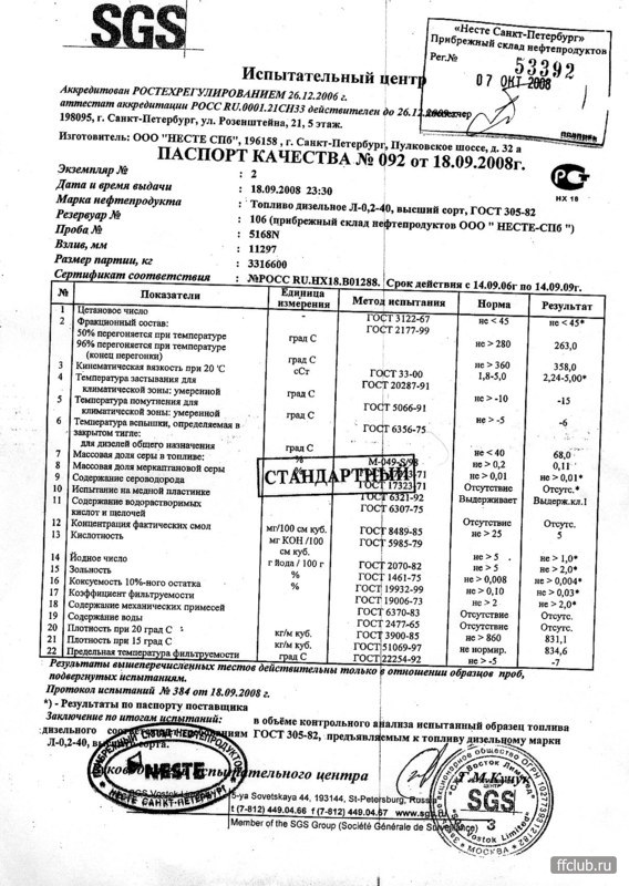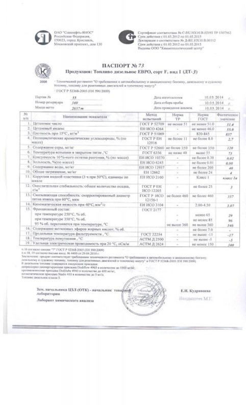 Итак, цетановое число для всех марок топлива равно 45, содержание серы либо 2,0 г, либо 500 мг на кг. Это важнейшие показатели, характеризующие топливо.