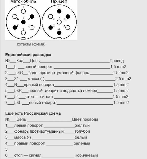 Для этого облейте эту деталь водой и посмотрите, будут ли протечки. Изменения эти заключаются в соединении одних проводов, ведущих к задней световой, сигнальной электрике прицепа автомобиля, с проводами от сцепного устройства. Крышка Предварительно ознакомьтесь с расположением всех семи подключаемых разъемов. Список лучших производителей: Bosal. Правильный подбор проводников по сечению позволяет не допустить перегрузку автомобильной проводки и выхода из строя предохранителей.
