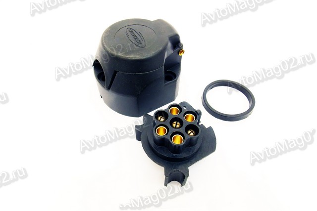 - корпус розетки для фаркопа с крышкой и резиновым уплотнительным кольцом. Обращаем внимание на нормальное прилегание всех деталей корпуса, отсутствие люфта или болтающихся в гнездах запрессованных латунных контактов, проверяем резьбы, состояние крепежных винтов на клеммах;