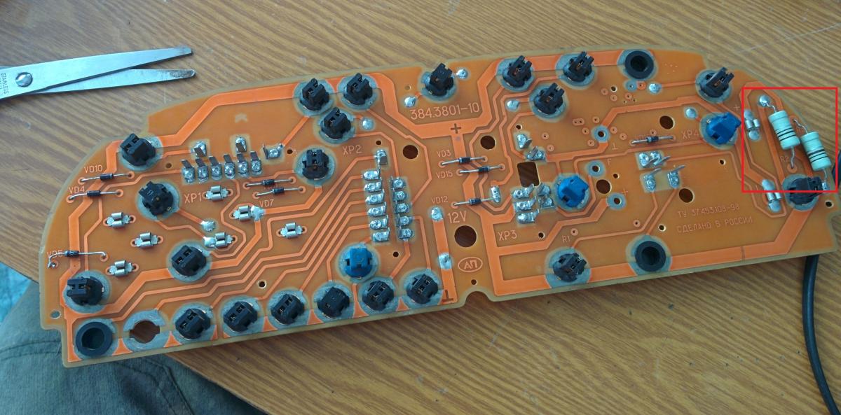 Разбираем панель и извлекаем тахометр (он держится на 3-х контактных гайках и 2-х саморезах. Затем аккуратно с помощью двух отверток снимаем стрелку, отклеиваем шкалу (тоже аккуратно).