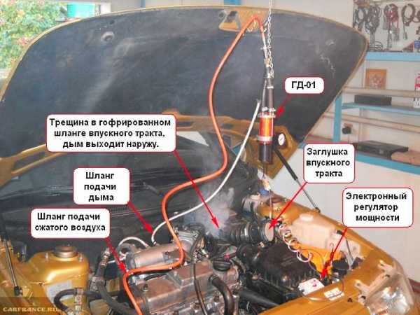 Зачастую ищут подсос либо пережимом шлангов, либо опрыскиванием вероятных мест горючими смесями, такими как: бензин, карбклинер или ВД-40. Но самым эффективным методом поиска места пропускания неучтенного воздуха, является применение дымогенератора.