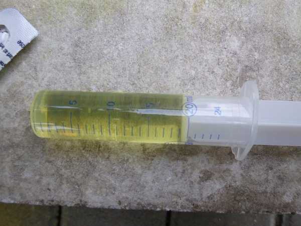 - Наберите в шприц объемом 20 см3 бензина.