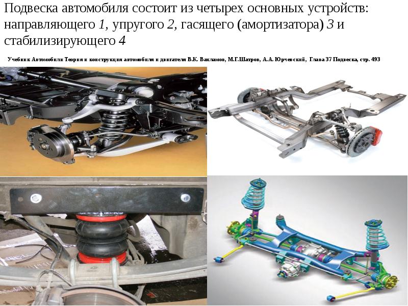 Каждая из этих базовых конструкций была модифицирована множеством различных способов для создания ряда вариантов подвески.Однако во всех этих конструкциях используются одни и те же основные принципы для обеспечения безопасной и комфортной езды.