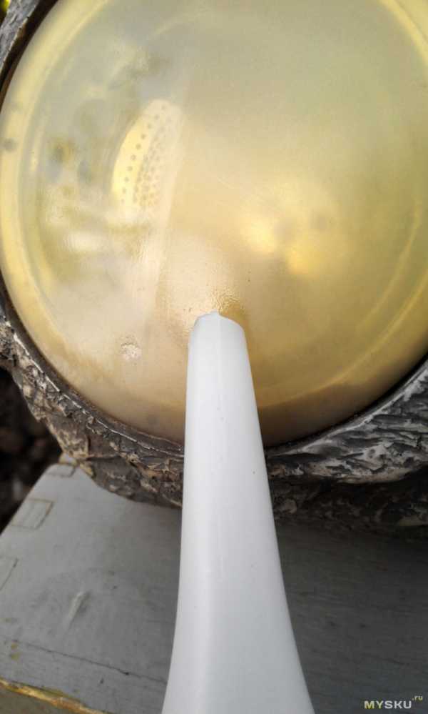 Подумалось, что состояние моей оптики, возможно, не позволит сделать однозначных выводов — не настолько еще все плохо. Поэтому начнем, пожалуй, с более простого подопытного (как раз, случайно, на глаза попался уличный светильник на солнечной батарее). Ему много лет, пластик пожелтевший и мутный — как раз то что «доХтор прописал» 😉