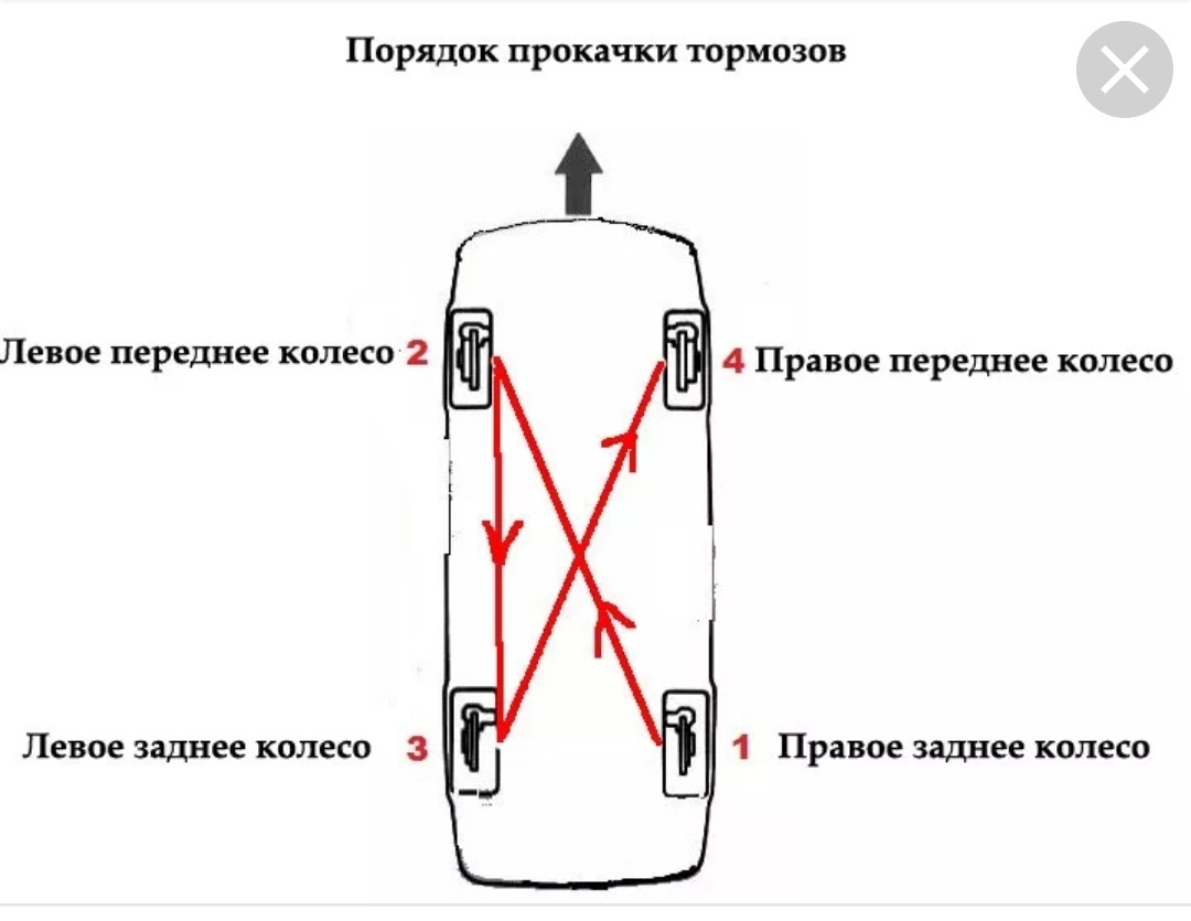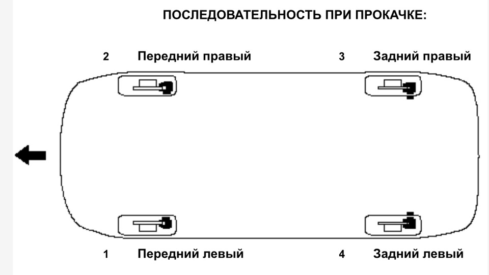 Начинать следует с самого дальнего тормоза (пассажирское заднее колесо) от главного цилиндра, но для некоторых автомобилей требуется другой порядок.