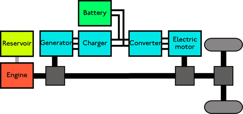 В последовательной гибридной трансмиссии двигатель внутреннего сгорания не передает крутящий момент непосредственно на ведущие колеса. Вместо этого двигатель питает электрический генератор, который обеспечивает электроэнергией тяговый электродвигатель. В последовательном гибриде используются две электрические машины:
