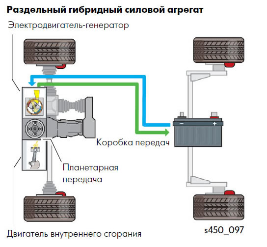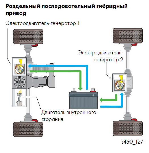 Чтобы решить эту проблему, а также обеспечить непрерывный полный привод, генератор (дополнительная электрическая машина) подключается с помощью ремённой передачи к двигателю внутреннего сгорания и вырабатывает электроэнергию для подзарядки тяговых аккумуляторов даже во время остановки авто.
