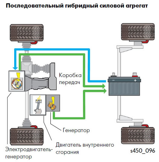 В серийном гибриде электродвигатель является единственным средством подачи мощности на колеса. Электродвигатель получает электроэнергию либо от аккумуляторной батареи, либо от генератора, работающего от бензинового двигателя. Компьютер определяет, какая часть энергии поступает от аккумулятора или двигателя/генератора. И двигатель/генератор, и использование рекуперативного торможения перезаряжают аккумулятор.