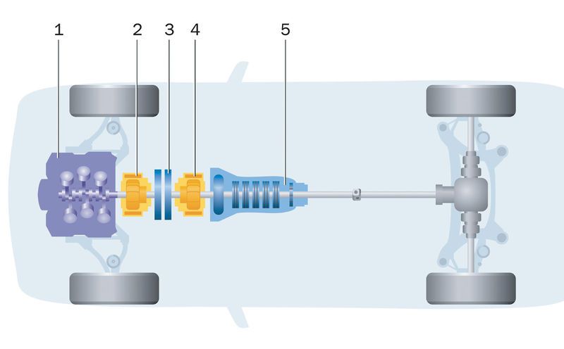 Для автомобиля с задним приводом (RWD) общая архитектура гибридной трансмиссии использует электрическую машину между двумя сцеплениями.