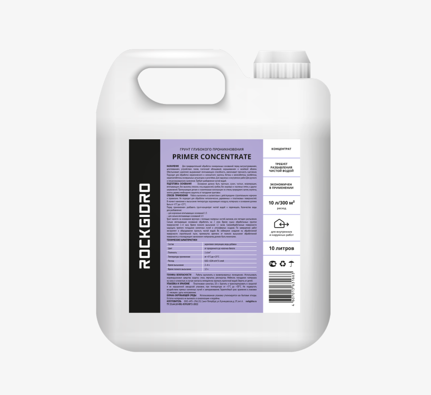 PRIMER (Праймер) – акриловый концентрированный грунт, предназначен для укрепления оснований. Наносится на бетонные, кирпичные, каменные, оштукатуренные поверхности, гипсокартон, перед нанесением красок, клеёв, штукатурок и шпатлевки, для внутренних и наружных работ. Грунт обладает высокой проникающей способностью, повышает поверхностную прочность, снижает впитывающую способность основания, связывает остаточную пыль, повышает адгезию материалов к основанию, обеспечивает долговременное сохранение качества получаемой поверхности и увеличивает срок службы наносимых в дальнейшем материалов. Разбавляется водой в пропорциях 1:4 с водой (укрепляющий грунт), 1:8 с водой (грунт глубокого проникновения), расход разбавленного материала 100-150гр/м2.