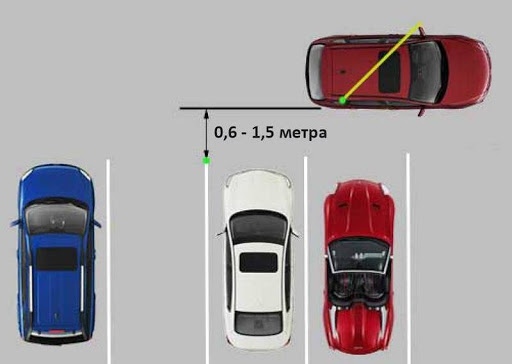 Простейший способ парковки задним ходом (рисунок 1)Итак, первое с чего нам необходимо начать маневр — выбрать правильную дистанцию между нашим правым бортом и припаркованными автомобилями.