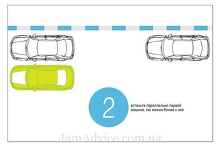Выбрали место, где припарковаться? Держим курс на автомобиль, стоящий впереди этого места.Сначала с ним нужно поравняться, а потом встать параллельно ему, на расстоянии от полуметра до метра.